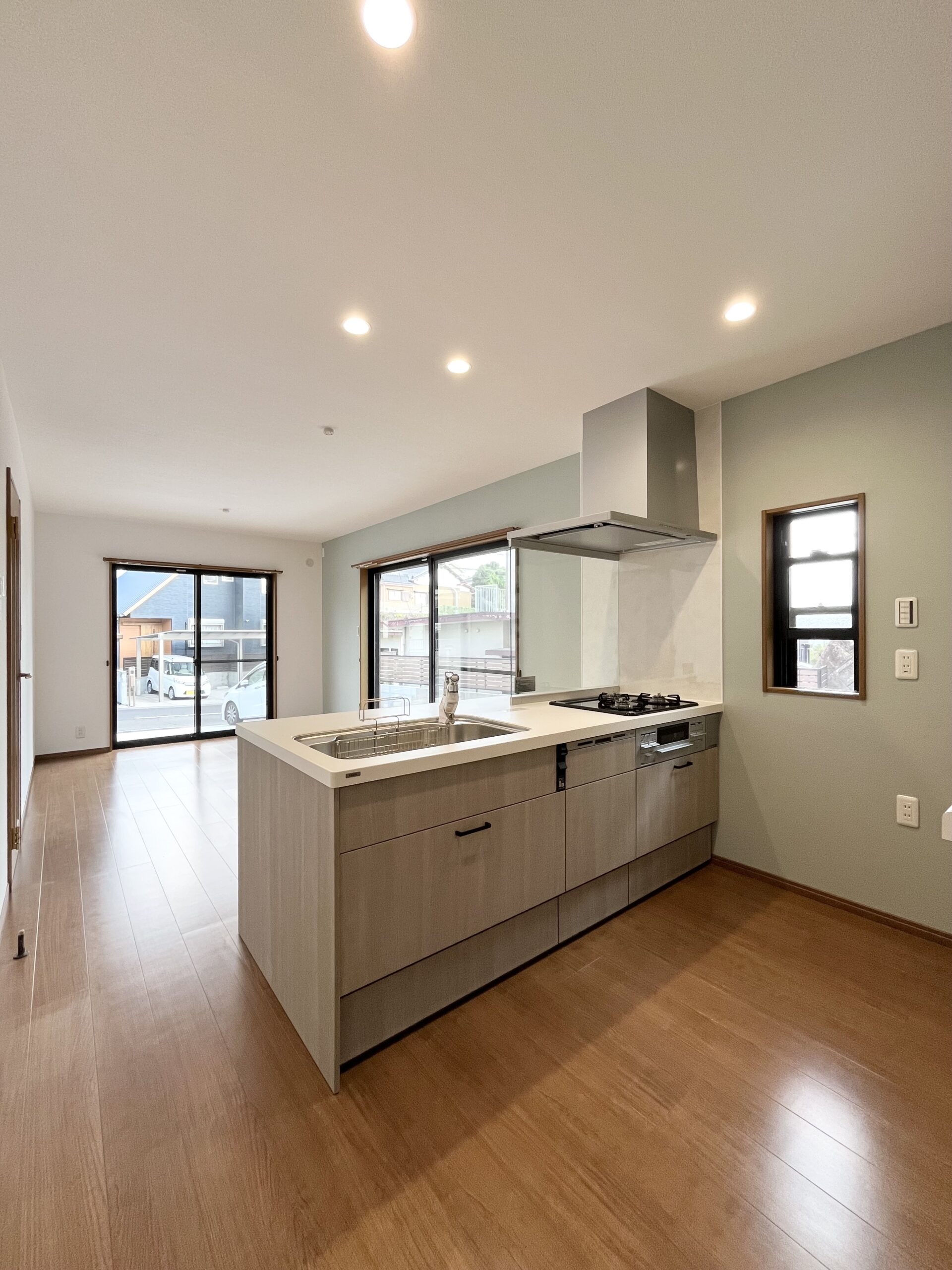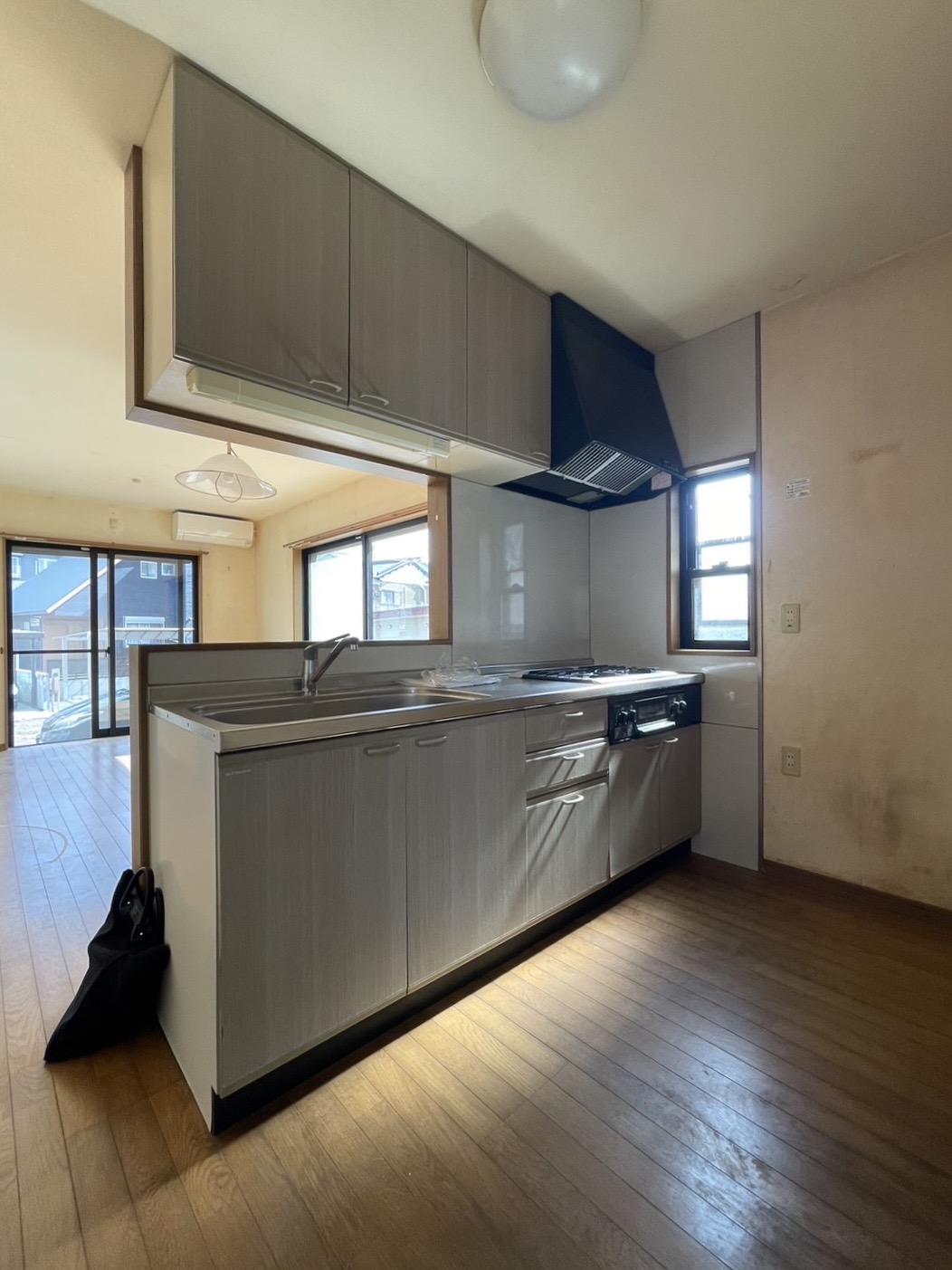 キッチン上の吊戸棚、コンロ前の壁を撤去し、家族の様子を伺いながら調理ができる空間に変更