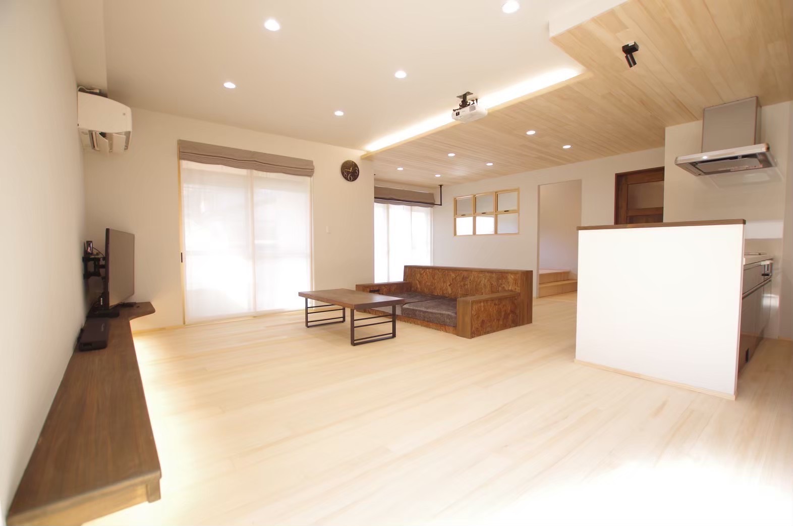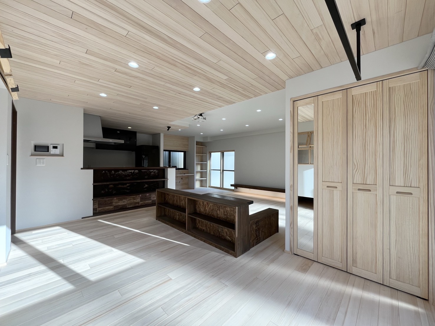 床と天井に自然素材のもみの木を採用!リビング収納の中にももみの木が張られています♪もみの木の効果で年間通して快適に過ごせます。