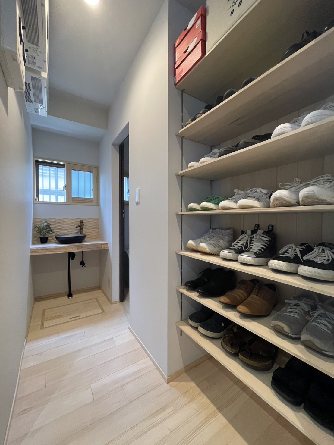 シューズボックスがオープンでも臭いは気になりません。手洗いのカウンター板は霧島神宮で伐採されたもみの木の一枚板を使用。