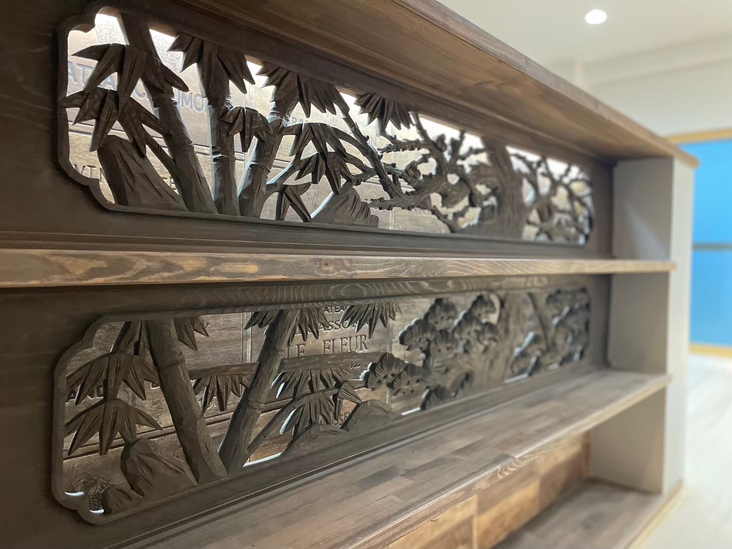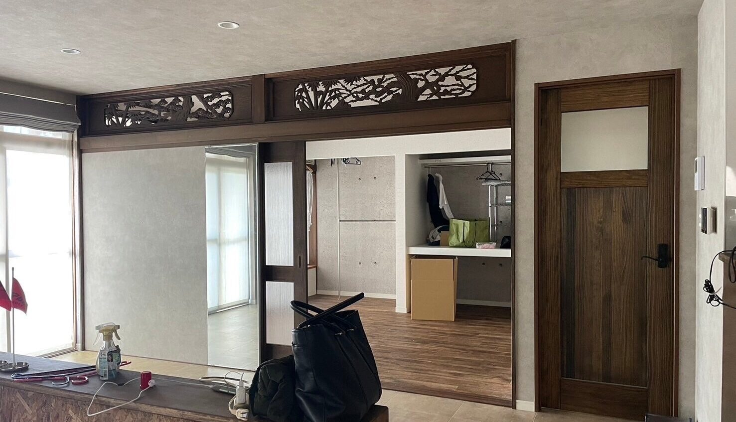 キッチン前の造作棚の背面には、もともと寝室に使われていた欄間を再利用しました。欄間に間接照明が当たり以前とは違った雰囲気を味わわせてくれます♪