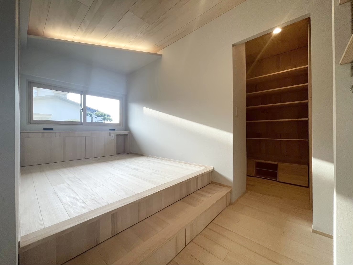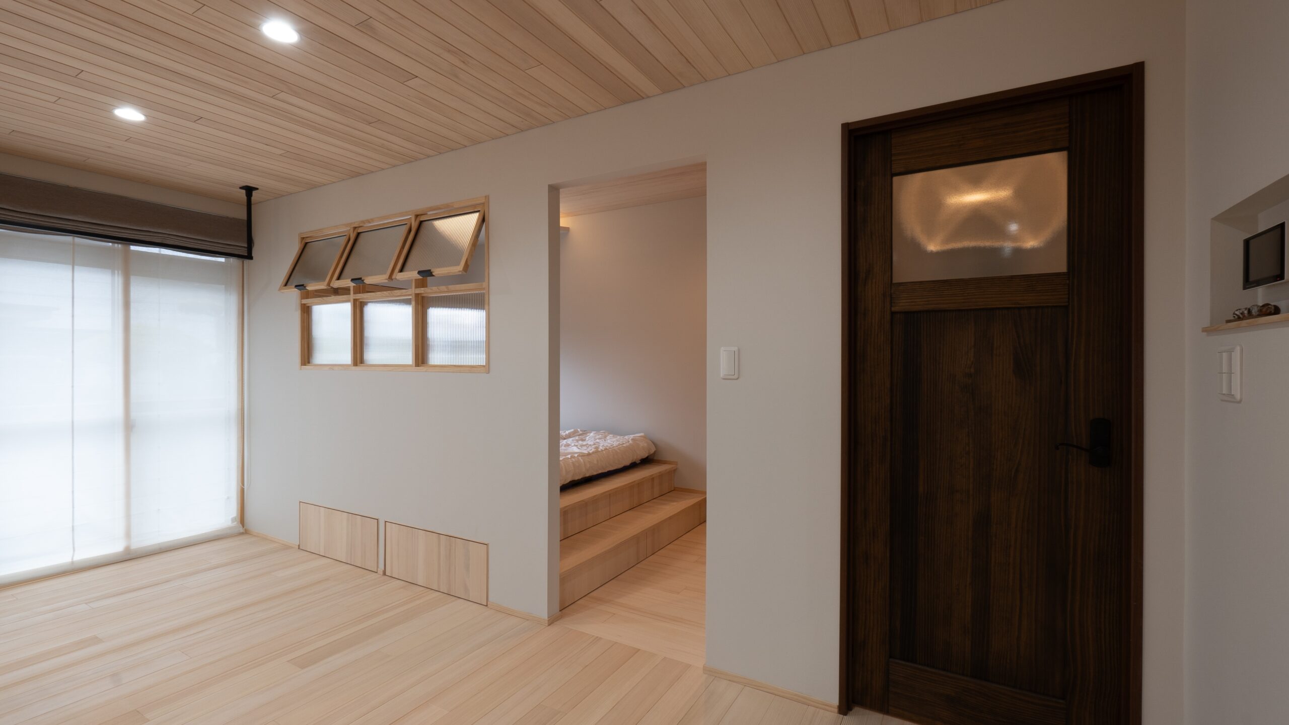 小上がりの主寝室。断熱を見直すため天然木の内窓を採用致しました!その奥に見えるのが・・・