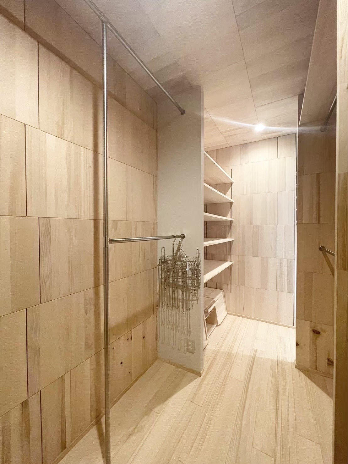ウォークインクローゼット。全面もみの木張りです♪もみの木の調湿、消臭、抗菌等の作用により空気のこもりがちな場所で効果を発揮してくれます。